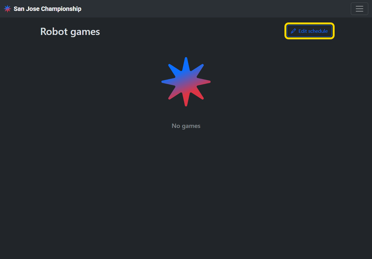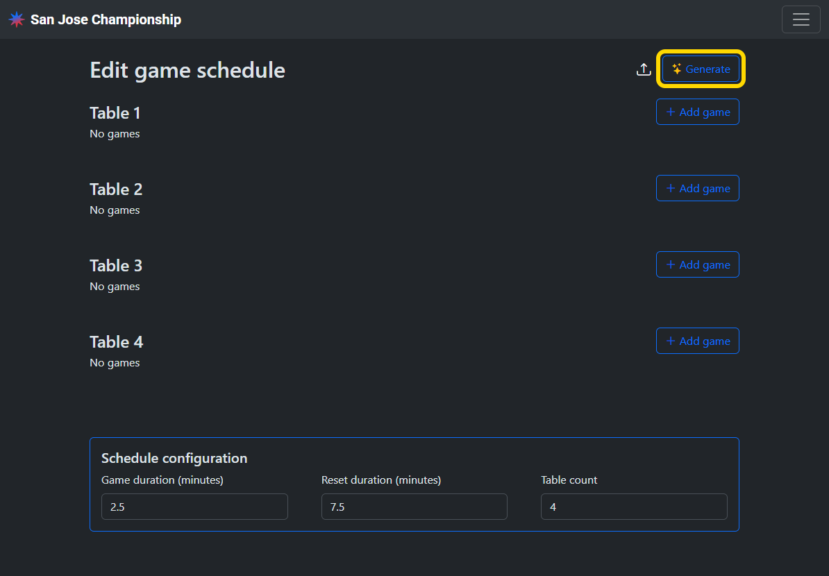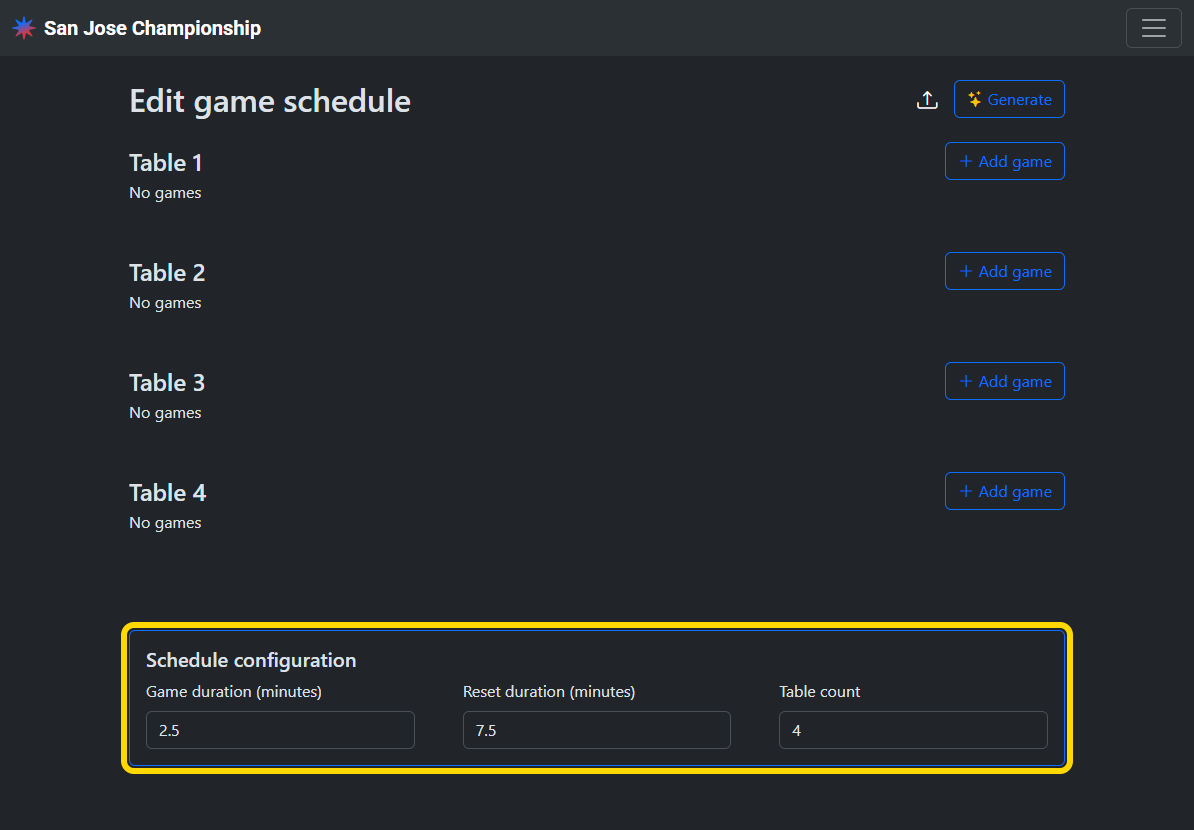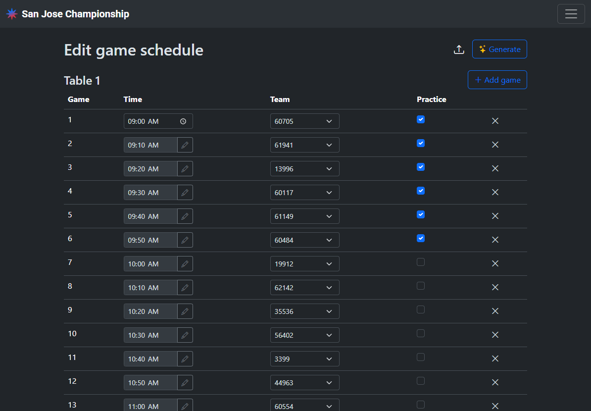 Tap the generate button and input the parameters for the schedule including start time, lunch break time, number of rounds per team, whether there should be a practice round and minimum time between activities. A schedule will be generated based on the configuration. If a judging schedule exists, then teams will not be scheduled matches that conflict with their judging session.