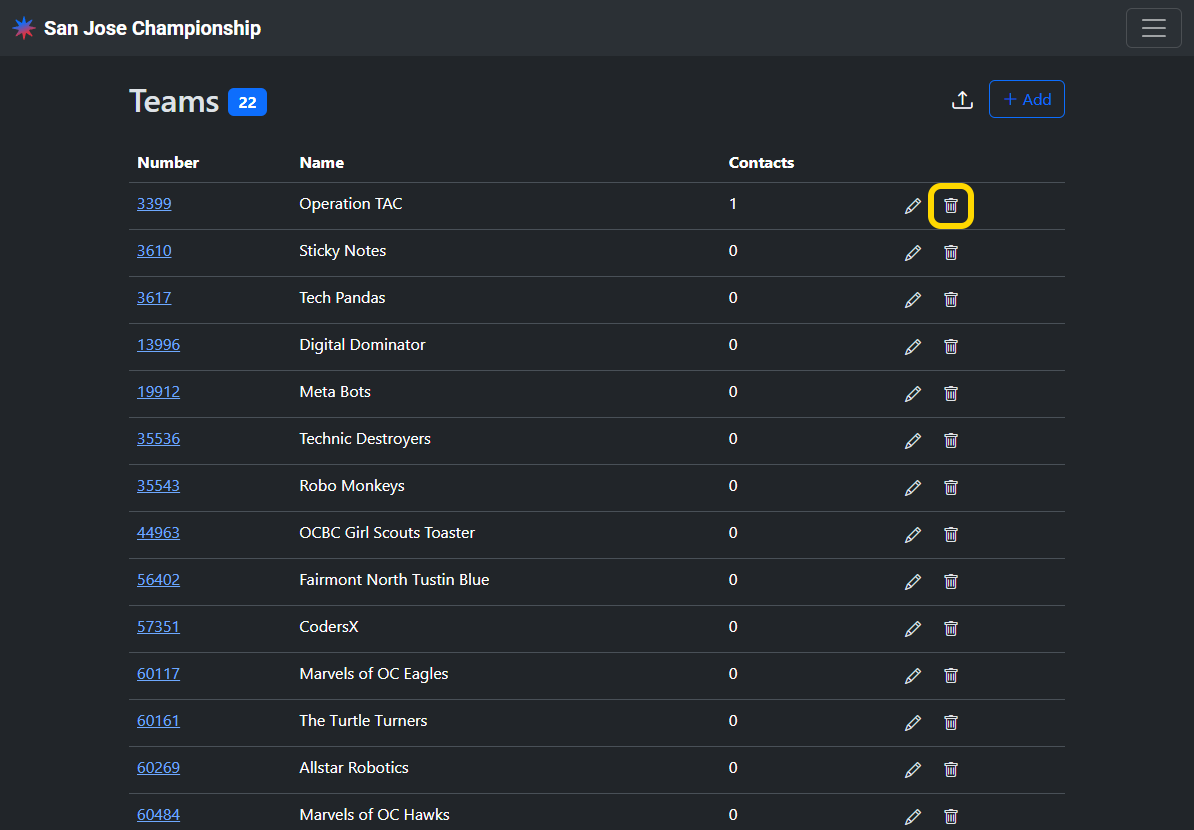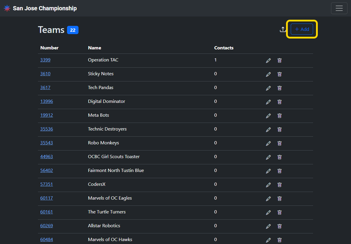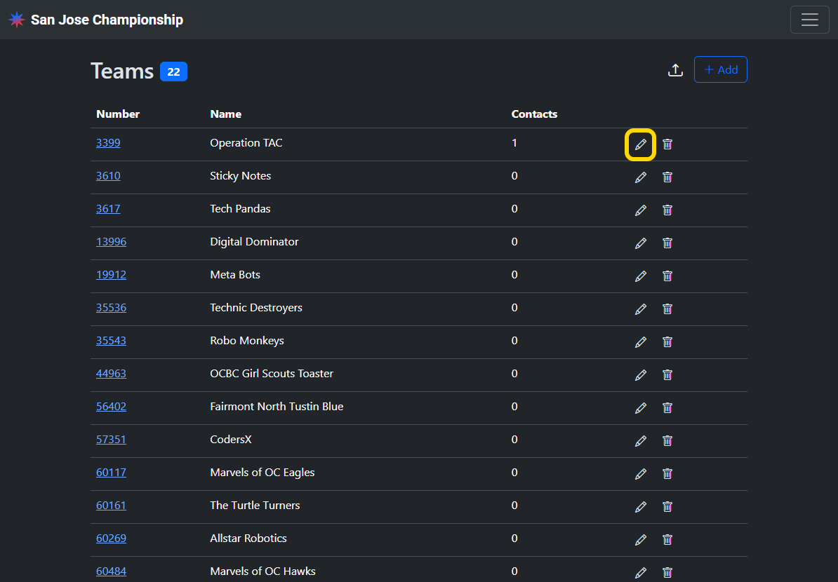 Update a team’s name or coach/mentor contact emails by tapping the edit icon button next to the team.