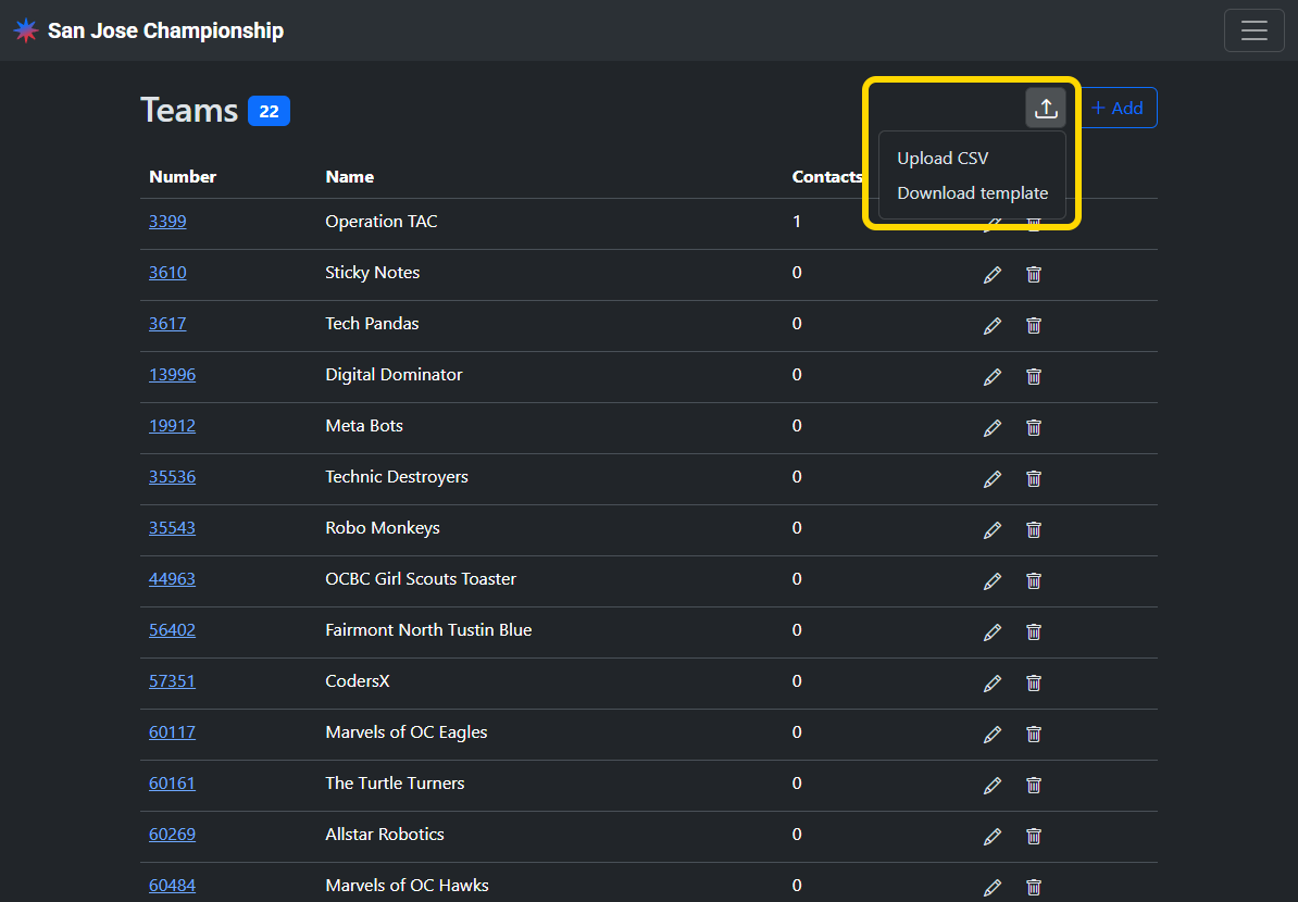 Teams can be added in bulk by uploading a CSV. A template CSV can be downloaded from the menu.