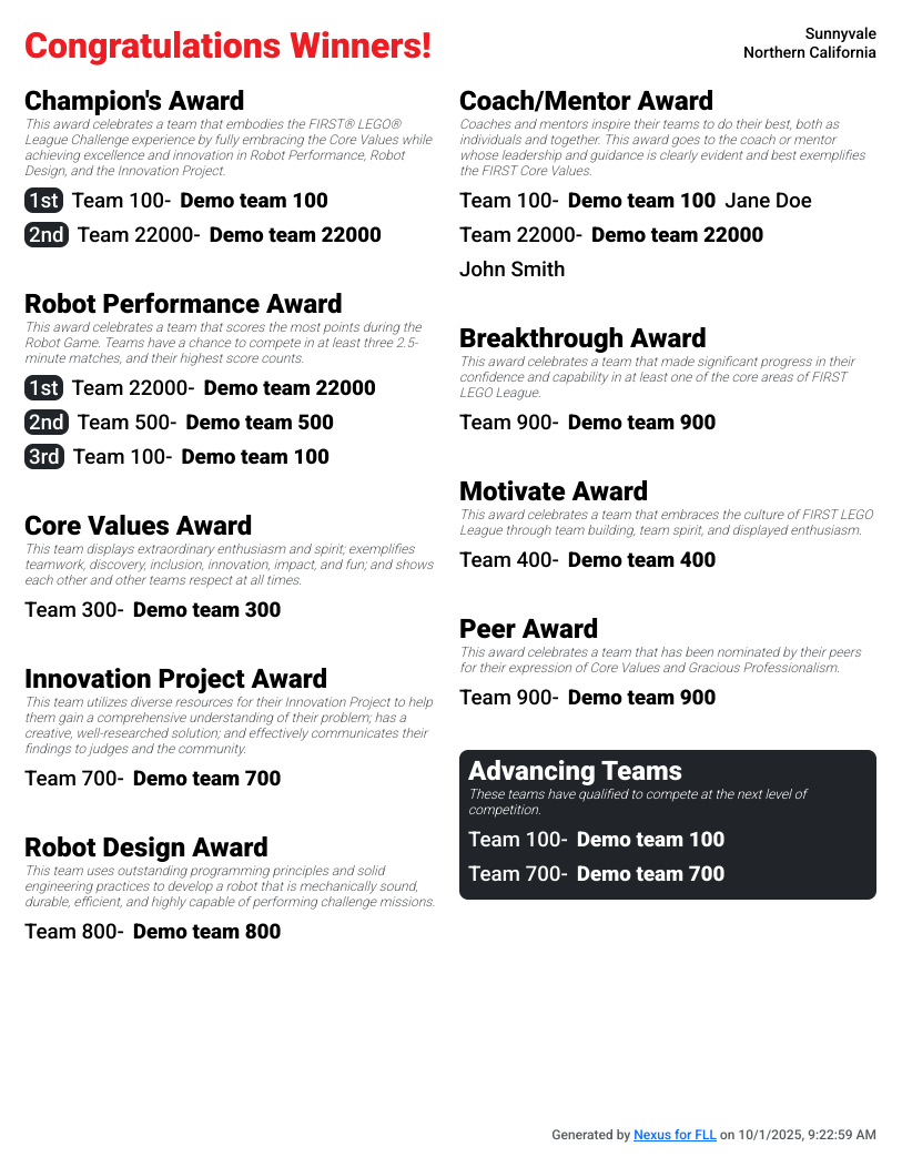 • If awards were entered into Nexus, each team will also receive a list of all award winners