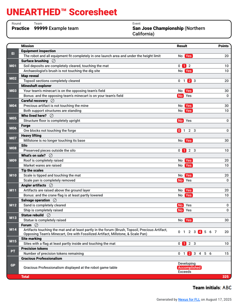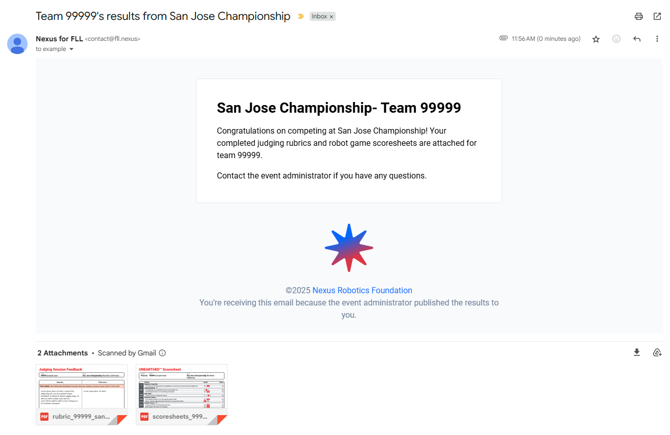 Each team coach/mentor email address can receive an email with completed scoresheets and rubrics attached after the conclusion of your event.